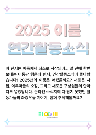 26년 이룸이 펼쳐 갈 활동을 심의하고, 임원을 선출할 이번 총회에서 회원분들과 반가운 인사를 나눌 수 있기를 기대합니다!