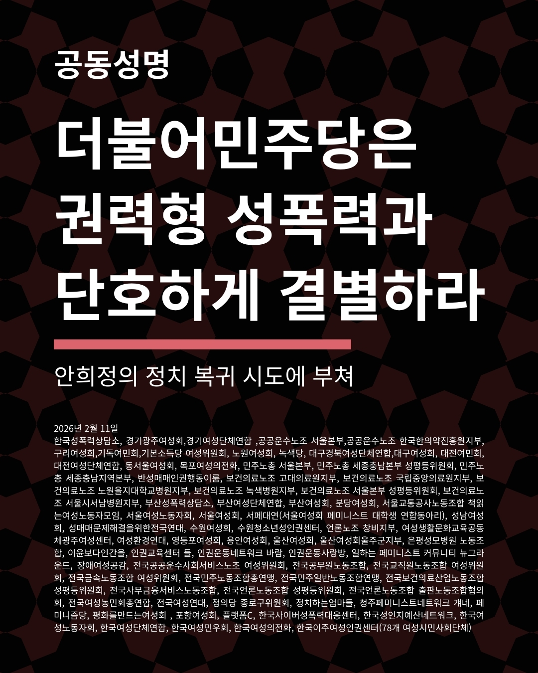 폭력을 가능하게 한 권력과 문화를 돌아보지 않는 한, 성폭력은 결코 근절될 수 없다. 그럼에도 더불어민주당은 여전히 성폭력 가해자를 단호하게 끊어내지 못한 채, 그 권력을 옹호하고 지지하며 다시 올라타고 있다. 이는 권력형 성폭력을 중요하게 다루지 않는다는 정당의 메시지이자, 지방선거를 앞두고 성폭력 없는 사회와 성평등한 정치를 바라는 주권자를 우롱하는 행위이다.