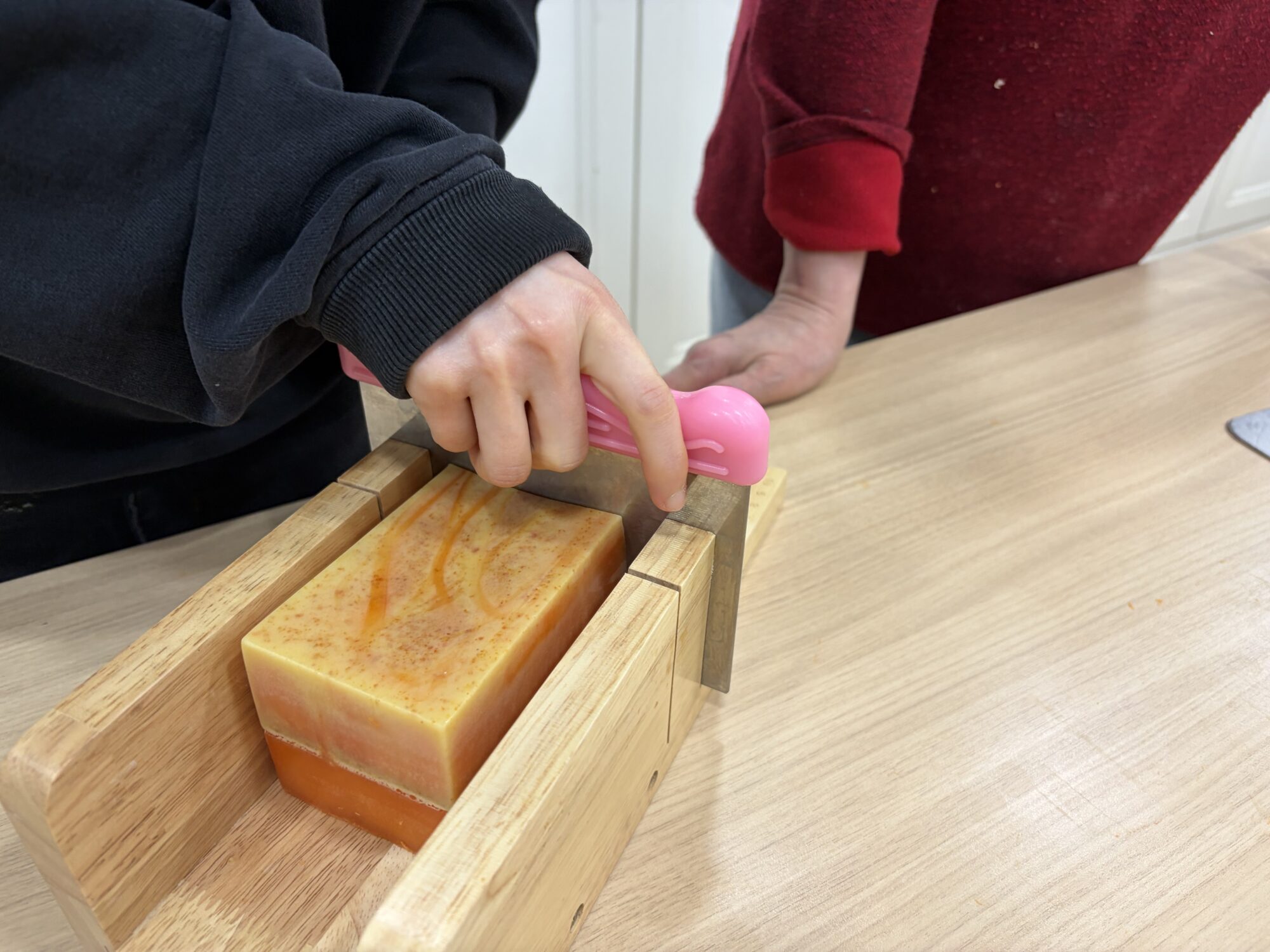 그런데 이번 비누 만들기에는 애로사항이 좀 있었어요. 비누를 만들고 난 후 적당히 굳은 다음 잘라야 하기 때문에 기다리는 시간이 필요하거든요. 프로그램을 마친 강사님이 귀가하시고 언니들만 남아 비누를 자르기 시작했는데요, 아니 글쎄! 비누 커터기의 줄이 끊어져버린 게 아니겠어요. 다행히 미리 사두었던 줄을 찾아 유투브를 보며 설치했지만 뚝! 하고 또 끊어지고 마지막 남은 하나조차 뚝!!! 하고 끊어져버렸답니다. 이럴수가(줄 하나에 4,500원인데 허걱)!! 그런데 다음 시간에 선생님과 함께 작업하자니 비누가 많이 굳어 딱딱해지면 자를 수가 없다고 하시더라고요. 이미 에너지를 많이 써 힘들지만 언니들과 함께 수제로(?) 비누를 자르기 시작했어요. 스테인리스로 된 쟁반에 대고 비누칼로 자르다, 예전에 쓰던 나무 틀을 찾아서 잘라보다.. 삐뚤빼뚤하게 잘린 아이는 다시 다듬기도 하고. 언니들이 장인정신을 불태웠지요. 3월 작업장 담당인 현빈도 팔을 걷어부치고 나서서 열심히 잘랐답니다.