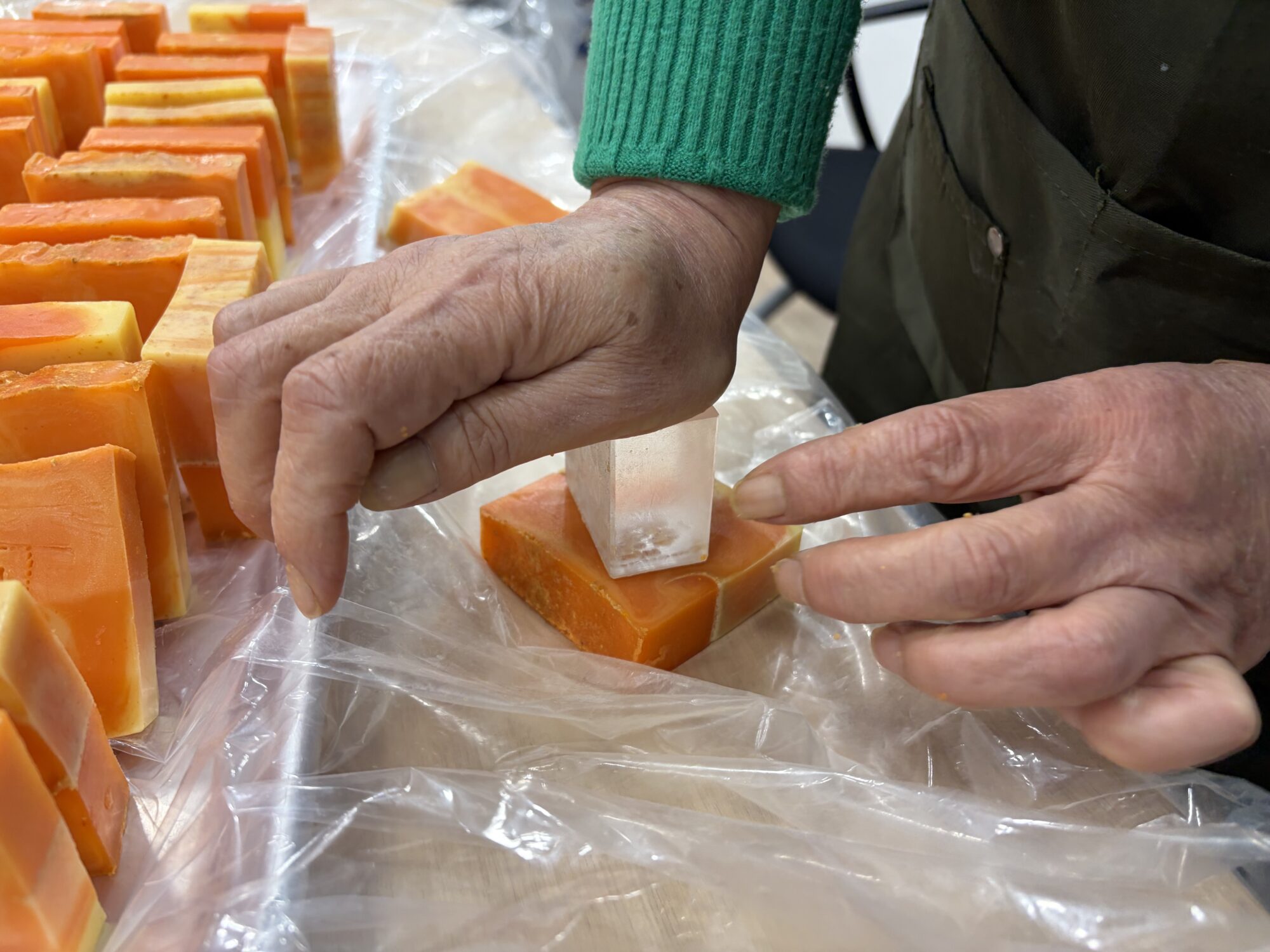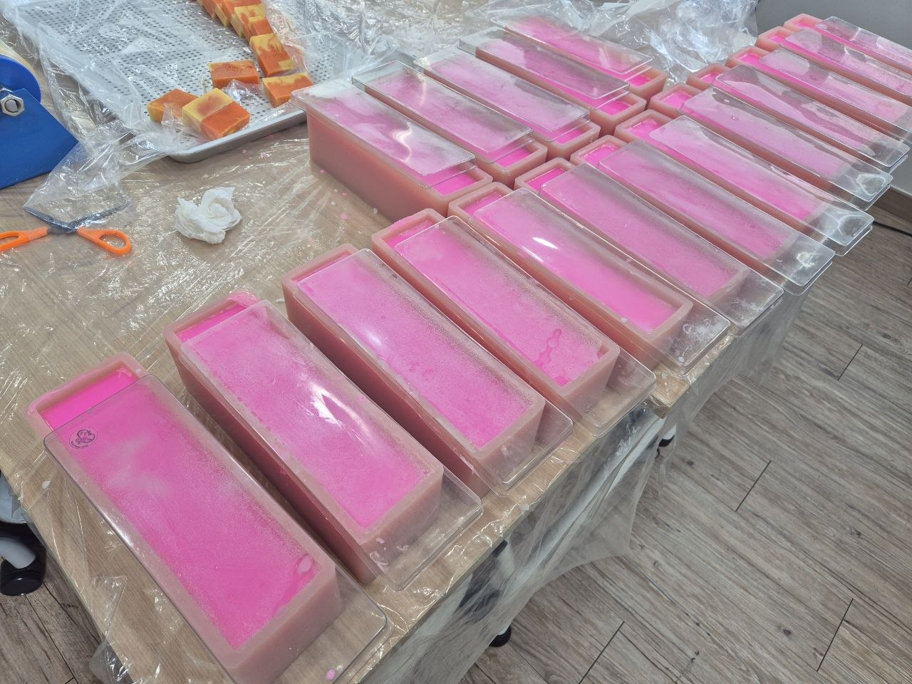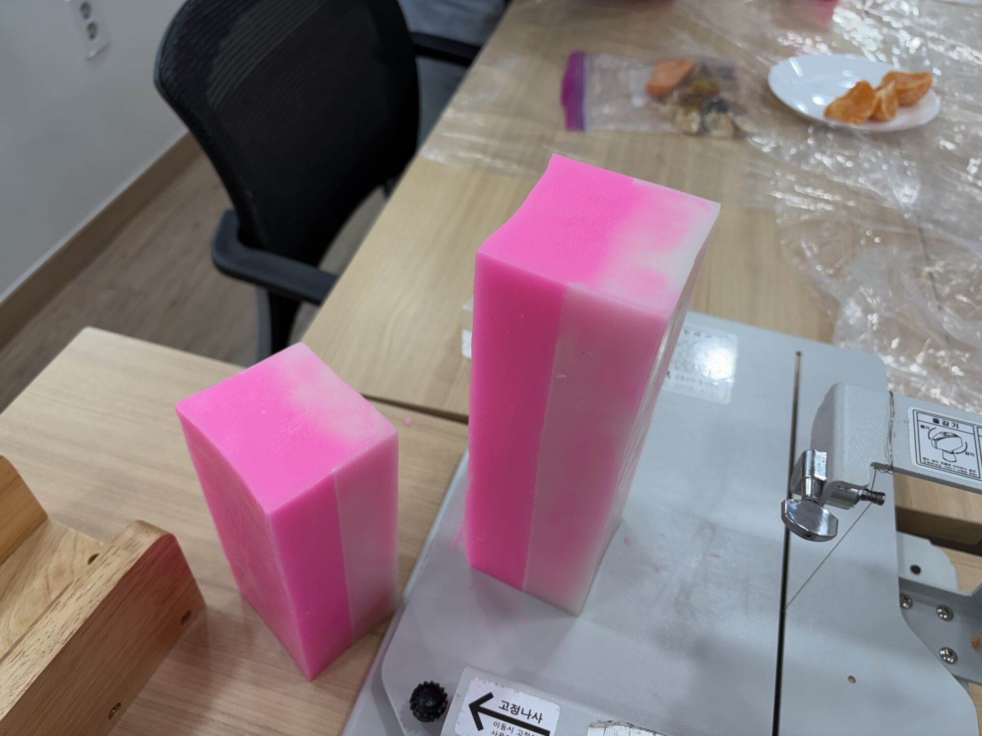 그리고 다음 시간에 다시 만난 언니들은 선생님과 함께 찐분홍 진달래 색의 진주&유노하나 비누를 만들고, 비누 커터기를 사용해 한 번도 줄을 끊지 않고 모두 잘 자르셨어요. 물론 줄을 엮은 커터기도 하나하나 팔에 힘을 주어서 자르니까 힘이 드는 건 매한가지인데요, 그래도 비누칼을 쓰는 것보다는 힘이 좀 덜 들어가는 것 같아요. 비누 만들기는 생각보다 꽤 힘이 많이 들어가는 공정이랍니다. 그래서 완성된 비누들을 보고 있으면 언니들의 애씀이 느껴져 뭉클해요. 화기애애한 언니들 분위기(때로 고성이 오가는데 싸움인지 경상도 말씨인지 저는 아직도 헛갈려요;;;)도 떠오르고요.