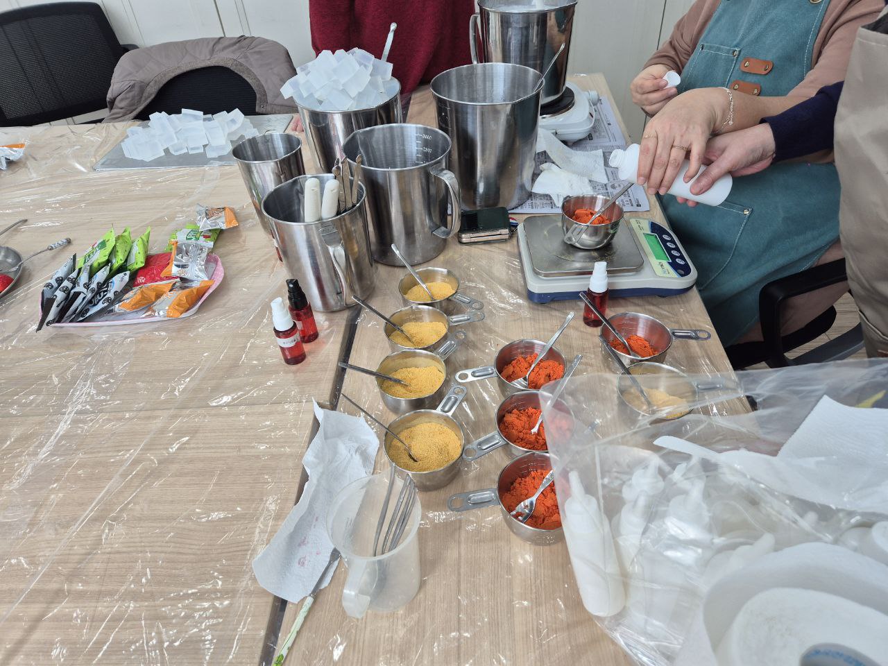 자, 그리고 3월에는! 아직 완료되지 않은 구독자 모집이 진행되고 있는 채로 친환경 화장품 만들기 첫 시간이 진행되었습니다. 바로바로 천혜향&파프리카 비누 만들기였어요. 제가 원료에 대해서는 잘 모르지만, 선생님께 들었는데요, 색소나 오일 조금 넣는 것과 달리 우리 비누는 진짜 분말을 넣어서 고급으로 만드는 거래요. 들어가는 오일도 좋은 것들을 쓰고요. 좋은 재료로 만드는 비누, 한 땀 한 땀 만드는 언니들에게도, 완성된 비누를 받아볼 구독자분들에게도 즐거움이기를 바랍니다.
