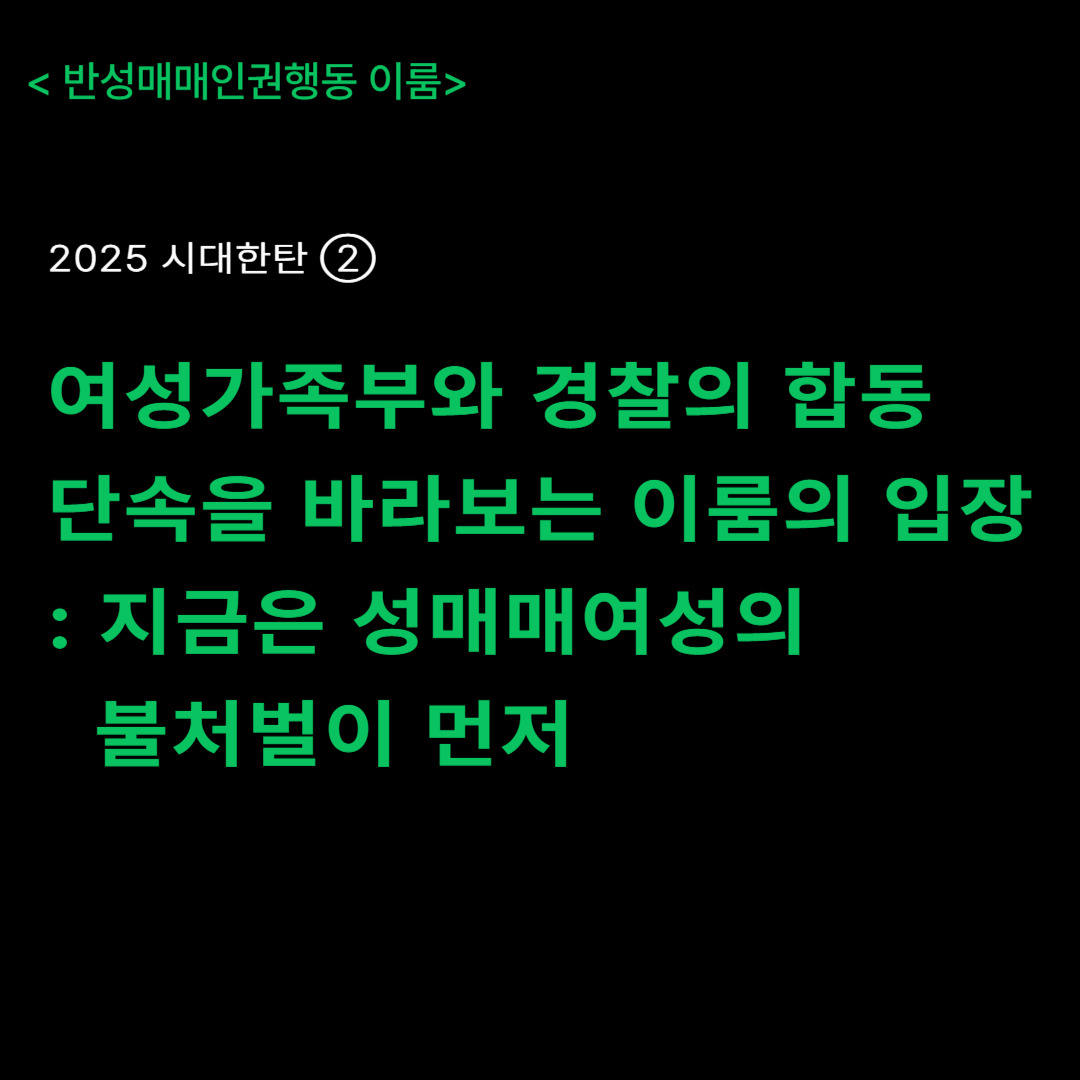 불처벌이 되지 않은 상황에서는 어떤 단속도 성매매 여성 처벌에서 자유로울 수 없다. 임금체불, 성폭력, 위협, 강도 등 성매매 여성들이 어떤 부당한 일을 당해도 참을 수밖에 없는 이유는 그들에 대한 법적, 사회적 처벌이 있기 때문이다. 성매매 산업을 지속시키는 가장 치명적 원인은 여성들의 침묵과 고립을 만드는 사회적 낙인과 법적 처벌이기에, ‘단속’이 정말 기대하는 효과를 내려면 성판매 여성 불처벌과 성매매 산업에 대한 구조적 개입이 먼저 필요하다. 합동 단속은 그 이후에 고민해도 늦지 않다. 성판매 여성에 대한 법적 처벌과 사회적 낙인을 먼저 철폐할 때, 여성의 몸에 대한 종속으로 이윤과 ‘유흥’을 얻는 이들에게 책임을 물을 수 있는 환경이 마련될 것이다.