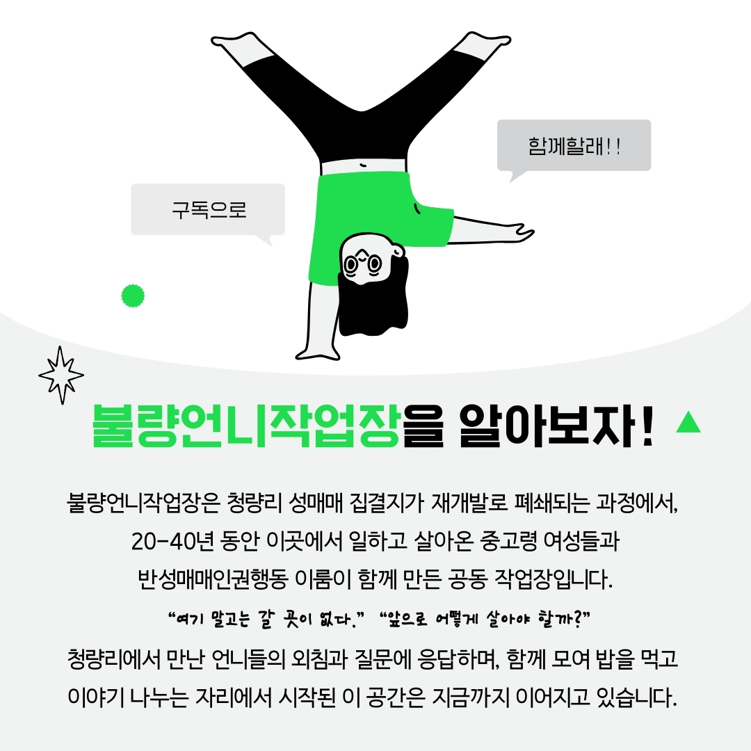 청량리에서 만난 언니들의 외침과 질문에 응답하며, 함께 모여 밥을 먹고 이야기 나누는 자리에서 시작된 이 공간은 지금까지 이어지고 있습니다.