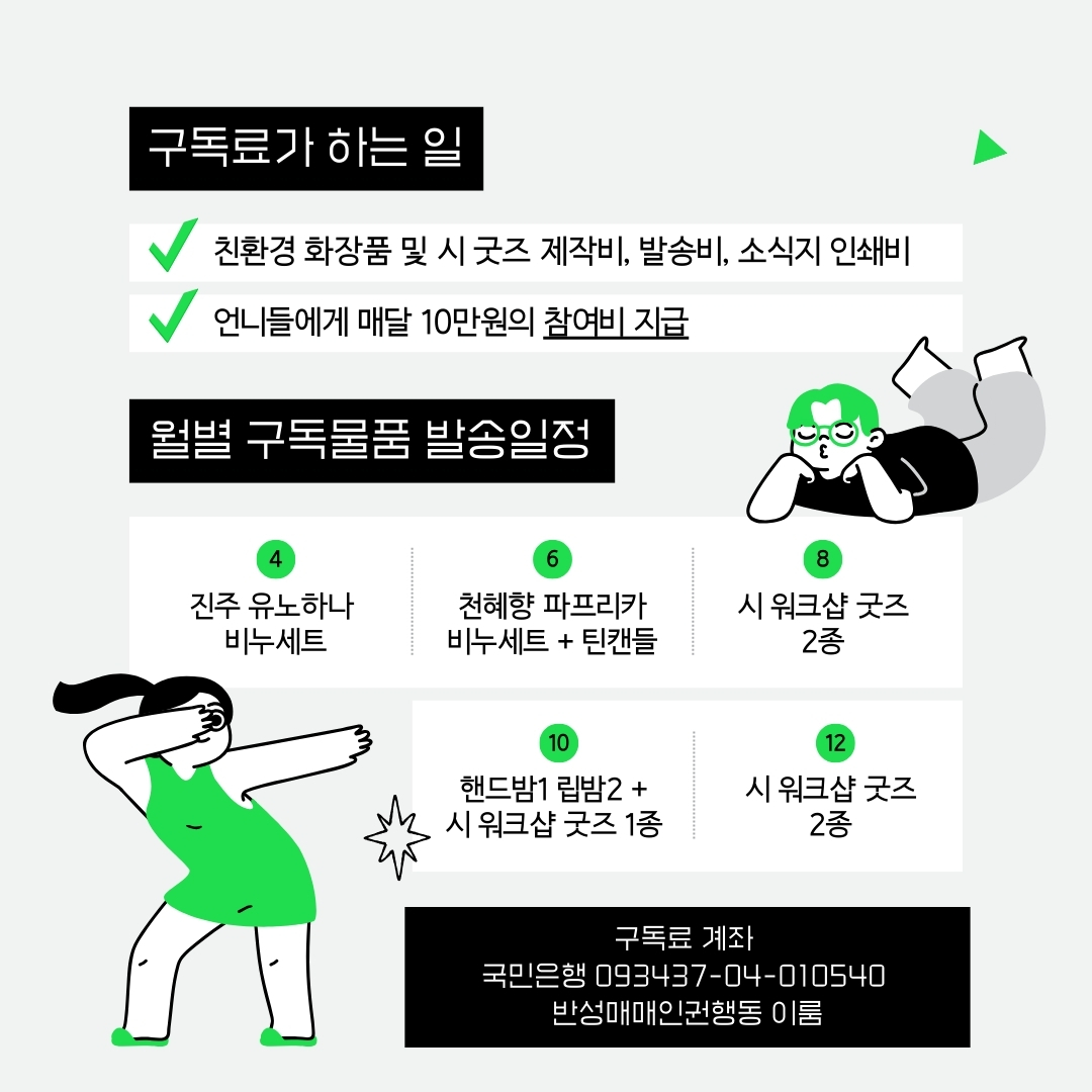 ⚠️ 불량언니작업장 구독료는 이체로만 가능하며, 기타 증빙이 불가능합니다. 또한, 불량언니작업장 구독료는 후원 성격이 있지만, 개인사업자로 운영되기에 기부금영수증이 불가능합니다.