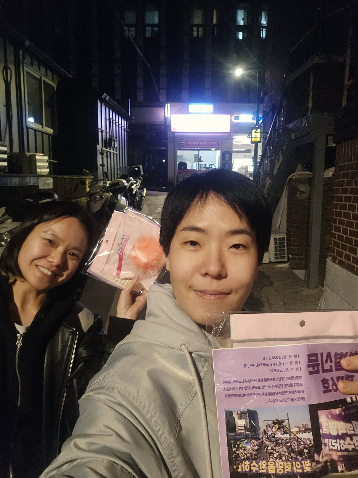 3월 20일 금요일, 샤워볼을 들고 별별신문에는 3.8여성의 날 소식을 담아 이태원 아웃리치를 다녀왔습니다. BTS의 광화문 공연 전날이었던 터라 관광객들이 많았는지, 이태원역에 사람이 어마어마하게 많아 역 출구까지 밀리듯 올라가야 했어요. 날짜를 잘못잡았나 걱정을 하며 올라갔는데, 저희가 만나는 반잔바와 TG바 거리와 업소는 평소와 차이가 있지는 않았어요. 몇몇 분께 내일 공연 때문에 이태원에도 사람이 많은 것 같다고 말을 건네보았을 때에도 다들 ‘우리랑은 상관없는 얘기’라는 반응이셨어요. 매번 느끼지만, 반잔바와 TG바의 영업 현황과 이태원 거리의 유동인구가 많아지는 것과는 바로 직접적인 연관이 생기지는 않는 것 같습니다.